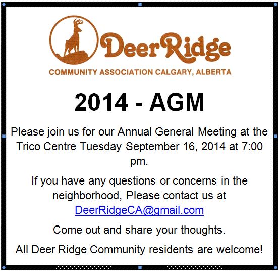 Deer Ridge Community AssociationDeer Ridge CA – AGM – Tuesday September 16, 2014 at 7 pm at the Trico Centre Meeting Room 7 & 8 Please come out to the AGM and support your Deer Ridge Community Association. Share this: Click to share on X (Opens in new window) X Click to share on Facebook (Opens in new window) Facebook Like Loading... Related