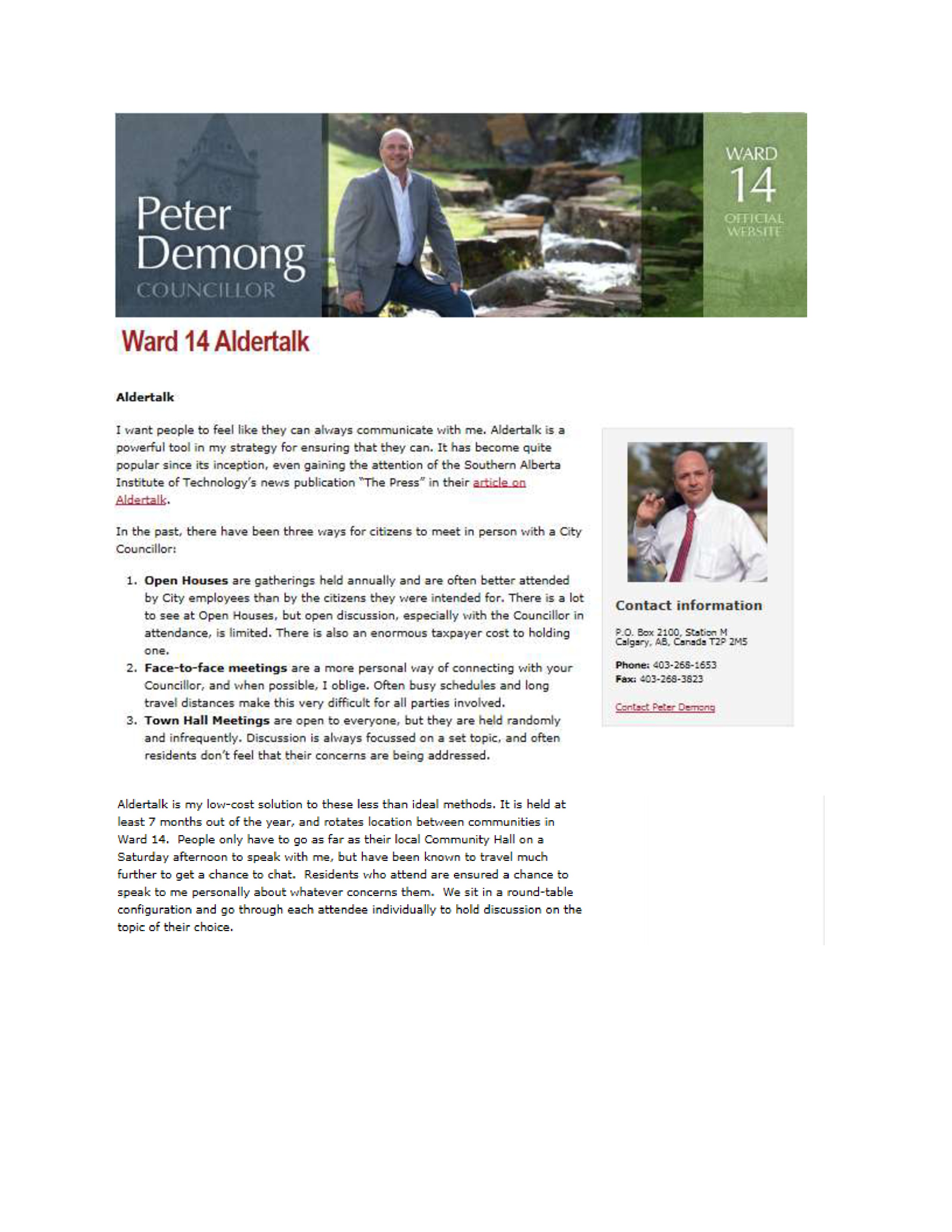 Visit http://www.calgary.ca/councillors/ward-14/Pages/Aldertalk.aspx?redirect=/aldertalk for more information.