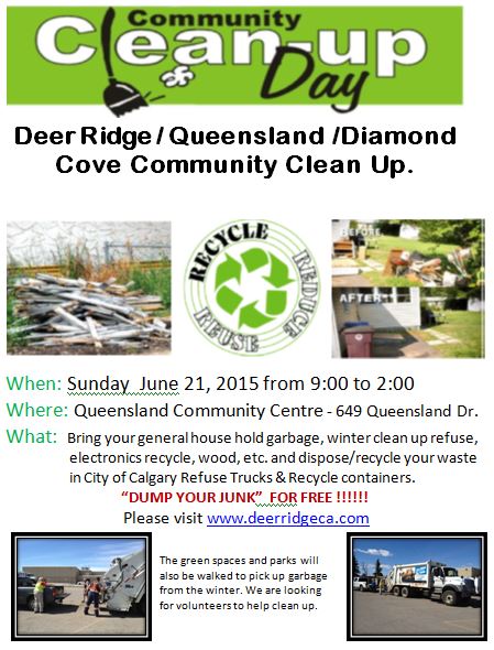 Come out and “Dump your Junk” at the Queensland Community Centre on June 21,2015. Volunteer to help the Deer Ridge CA walk our community parks and green spaces collecting the debris left over the winter months. Please contact Deer Ridge CA at deerridgeca@gmail.com for more information.