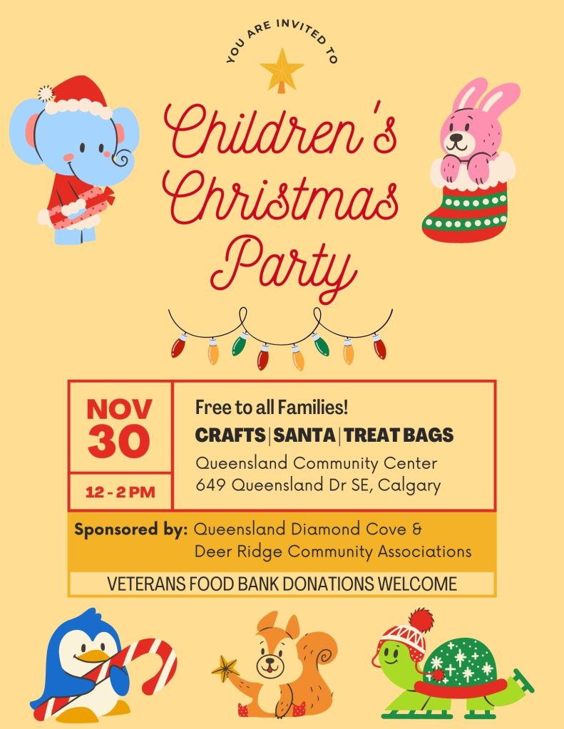 The party will take place at the Queensland Diamond Cove community hall, at 649 Queensland Drive SE, and is sponsored by the Queensland Diamond Cove and Deer Ridge Community Associations.